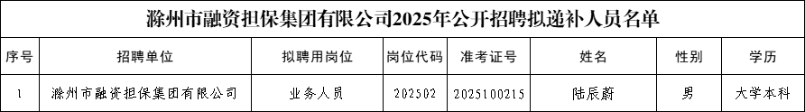 根據(jù)《滁州市融資擔保集團有限公司2025年公開招聘工作人員公告》相關(guān)規(guī)定,經(jīng)報名、資格審查、筆試、面試、體檢、考察等招聘程序,現(xiàn)將擬遞補人員予以公示。